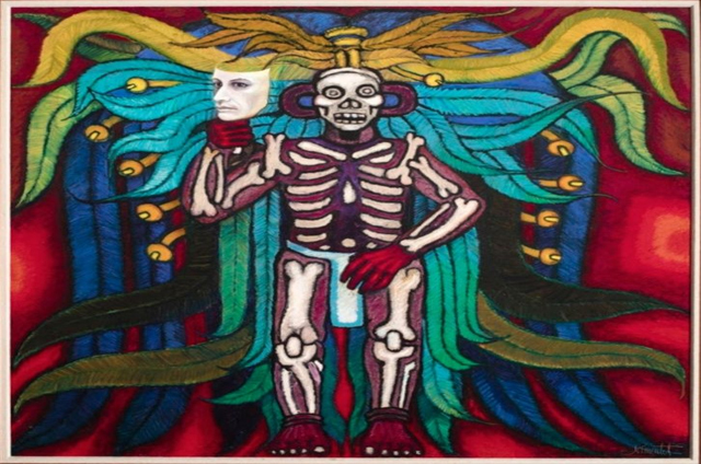 La exposición presenta también un “tzompantli” (estante prehispánico) hecho con cráneos, obra de Salvador Pizarro.
