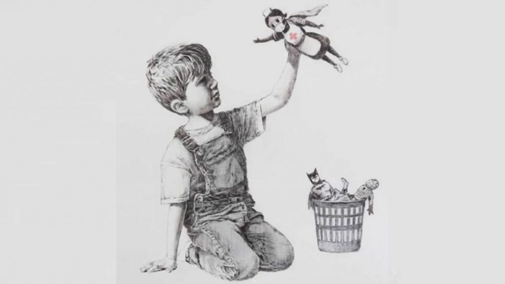 En la nueva obra de arte de Banksy, un niño elige a una enfermera como la superheroína con la que quiere jugar en lugar de Batman o el Hombre Araña, lo que resume la gratitud que los británicos han sentido hacia el Servicio Nacional de Salud (NHS, por su sigla en inglés) durante la crisis del coronavirus.