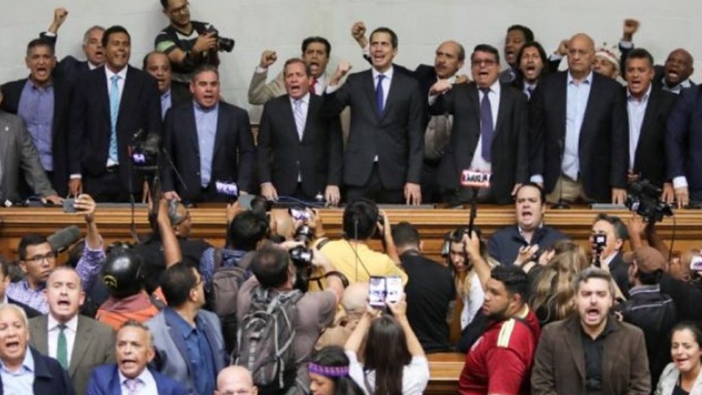 Caracas, Venezuela.- La mayoría opositora del Parlamento venezolano invistió de nuevo este martes al líder Juan Guaidó como presidente interino de Venezuela, tras una accidentada sesión en la que los diputados tuvieron que abrirse el paso hacia el Palacio Legislativo a la fuerza.