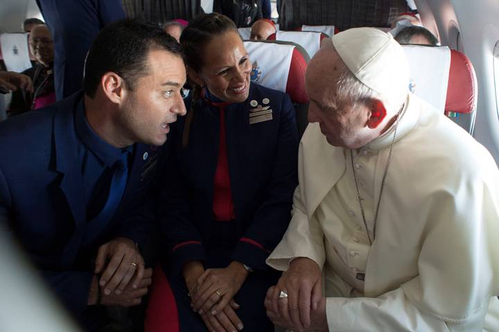 Podest, de 39 años, y Ciuffardi, de 41, azafata y azafato, dieron el “sí, quiero” a 11 mil metros de altura ante el pontífice después de que éste les preguntara si “estaban seguros”, contó el esposo.