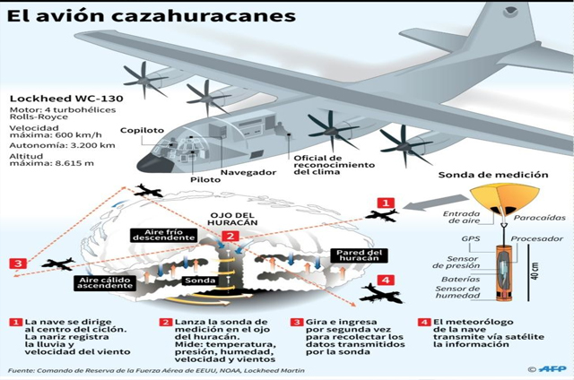 La nave se dirige al centro del huracán y con la nariz registra la lluvia y la velocidad del tiempo, para luego lanzar la sonda de medición en el ojo del huracán la cual reconoce la temperatura, presión, humedad velocidad y vientos.