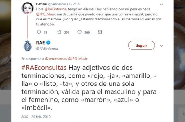 Esta vez, una joven quiso iniciar una discusión sobre lenguaje inclusivo haciendo referencia a las MarronAs (como forma femenina de Marrón), pero el organismo del idioma español salió del problema con una muestra de humor.