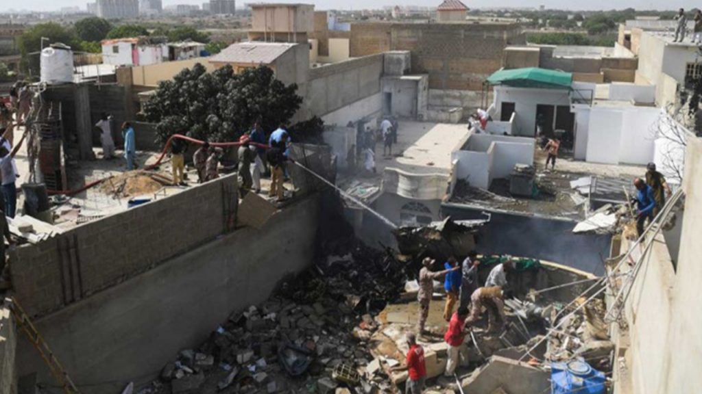 Las imágenes dadas por los medios pakistaníes pueden ver los restos del avión y el fuego en algunas casas de la zona. También se puede ver humo, reportó el canal de televisión NDTV.