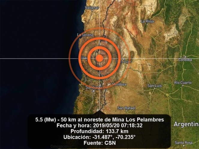 Un sismo de 5.5 grados de magnitud, cuyo epicentro se localizó en territorio argentino, sacudió las regiones de Atacama, Coquimbo, Valparaíso, Metropolitana de Santiago y O’Higgins, en el norte y centro de Chile, sin causar víctimas o daños visibles, según informaron las autoridades.
