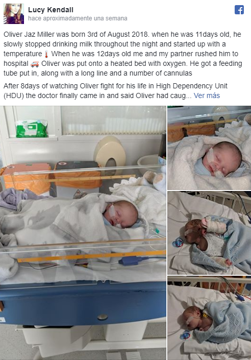 “Oliver nació el 3 de agosto y cuando tenía 11 días dejó de beber leche durante la noche y empezó a tener fiebre. Al día siguiente mi pareja y yo le llevamos al hospital y allí le ingresaron con oxígeno, una sonda para que se alimentase y numerosas vías”, de esta forma, Lucy comenzó a dar a conocer la historia de su bebé en redes sociales.