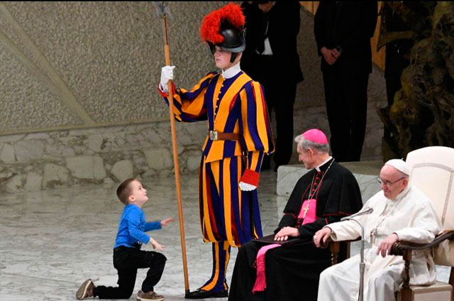 Mientras se leían algunos pasajes bíblicos en diversos idiomas, al inicio de la audiencia en la cual participaron unas 7 mil personas, el pequeño de no más de 10 años se acercó hasta donde estaba el Papa subiendo los escalones.