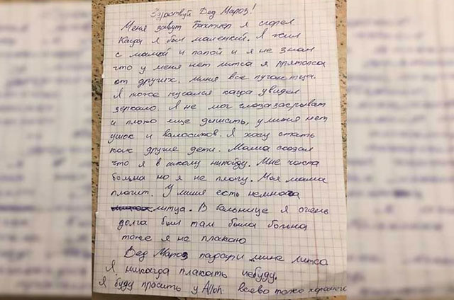 “Hola Papá Noel! Me quemé cuando era un niño pequeño. Perdí mi cara en el fuego y desde entonces tengo que esconderme de las personas”.