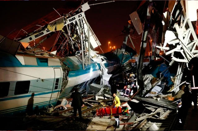 Un tren de alta velocidad golpeó una locomotora y se estrelló contra un paso elevado para peatones en una estación en la capital de Turquía, Ankara. Como consecuencia, murieron nueve personas y otras 47 resultaron heridas, dijeron funcionarios.