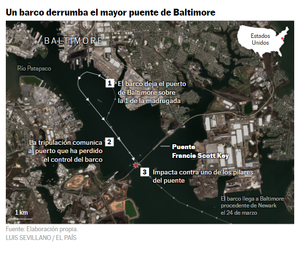 El puente que se derrumbó, conocido popularmente como el Key Bridge, tenía cerca de 3 km de largo y forma parte de la autopista 695 que rodea Baltimore.