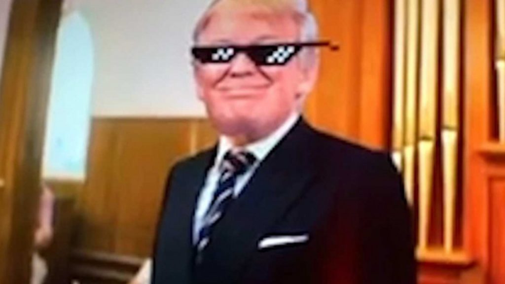 En una escena tomada de la película “Kingsman: The Secret Service”, una comedia de espionaje británica de 2015, la cabeza de Trump fue superpuesta al cuerpo de un hombre que dispara a personas cuyos rostros fueron cambiados por los logos de grupos mediáticos como CNN, The Washington Post y NBC.