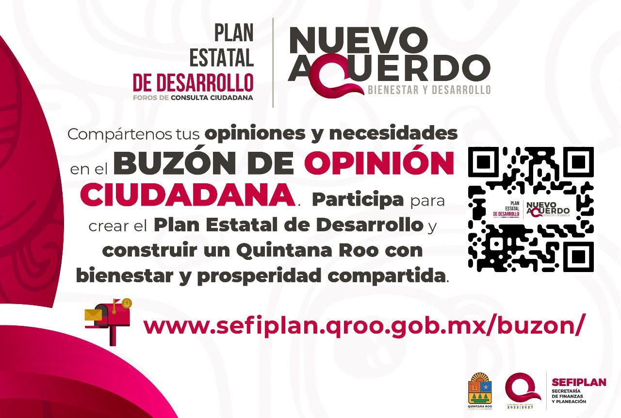 De acuerdo al secretario de Finanzas y Planeación (SEFIPLAN), Eugenio Segura Vázquez, las propuestas que se recaben en el buzón digital sefiplan.qroo.gob.mx/buzon, se adicionarán a las recopiladas en los foros de consulta ciudadana y las que fueron depositadas durante el mes de noviembre en los buzones físicos que estuvieron instalados en los once Ayuntamientos.