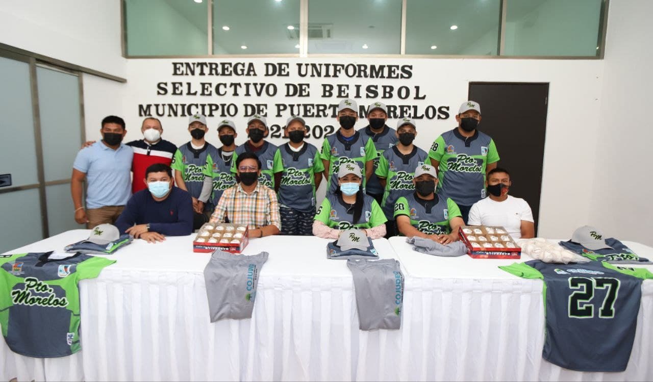PUERTO MORELOS.– La presidenta municipal Blanca Merari Tziu Muñoz entregó este viernes uniformes, gorras y pelotas, enviados por la Comisión para la Juventud y el Deporte de Quintana Roo (Cojudeq), a los integrantes del selectivo de béisbol de Puerto Morelos.