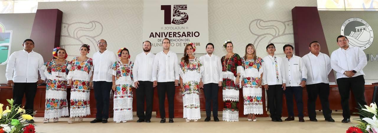 Tulum.- En el marco del 15 aniversario del municipio de Tulum, la gobernadora Mara Lezama Espinosa convocó a todas y todos sus habitantes al trabajo en unidad para la construcción del Tulum del futuro, a sentar las bases para un municipio próspero y pujante por los próximos 50 años, que ya inició con la construcción del Tren Maya y el aeropuerto Felipe Carrillo Puerto.