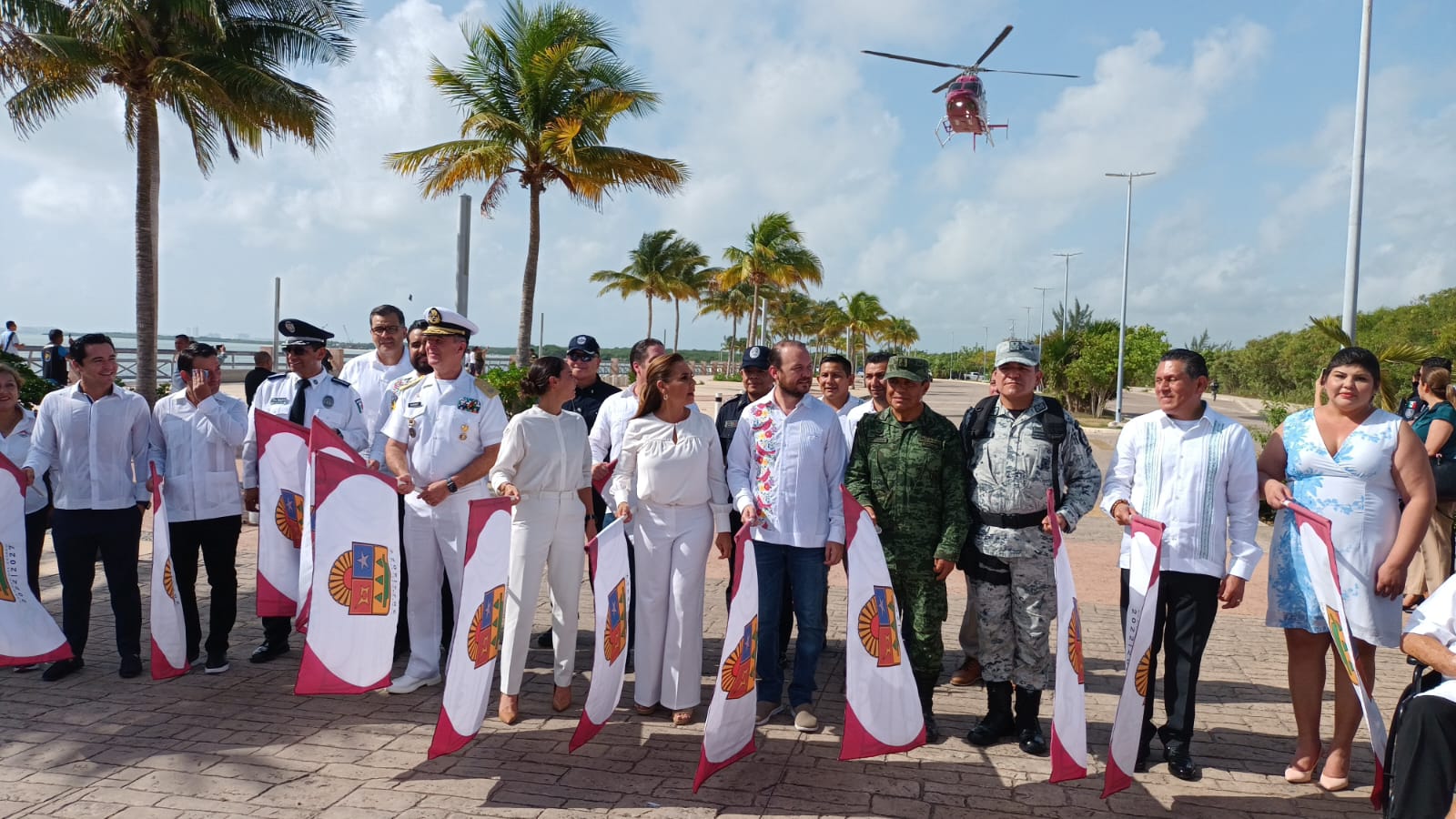 En este banderazo de operativo acompañaron a la gobernadora Mara Lezama el magistrado Heyden Cebada Rivas, presidente del Tribunal Superior de Justicia; el vicealmirante Martín Enrique Barney Montalvo, jefe del Estado Mayor de la IX Región Naval; el general brigadier Luis Valentín Iglesias Solórzano, de la guarnición militar de Cancún; el general Israel Noé Castillo Pérez, coordinador general de la Guardia Nacional en Quintana Roo.