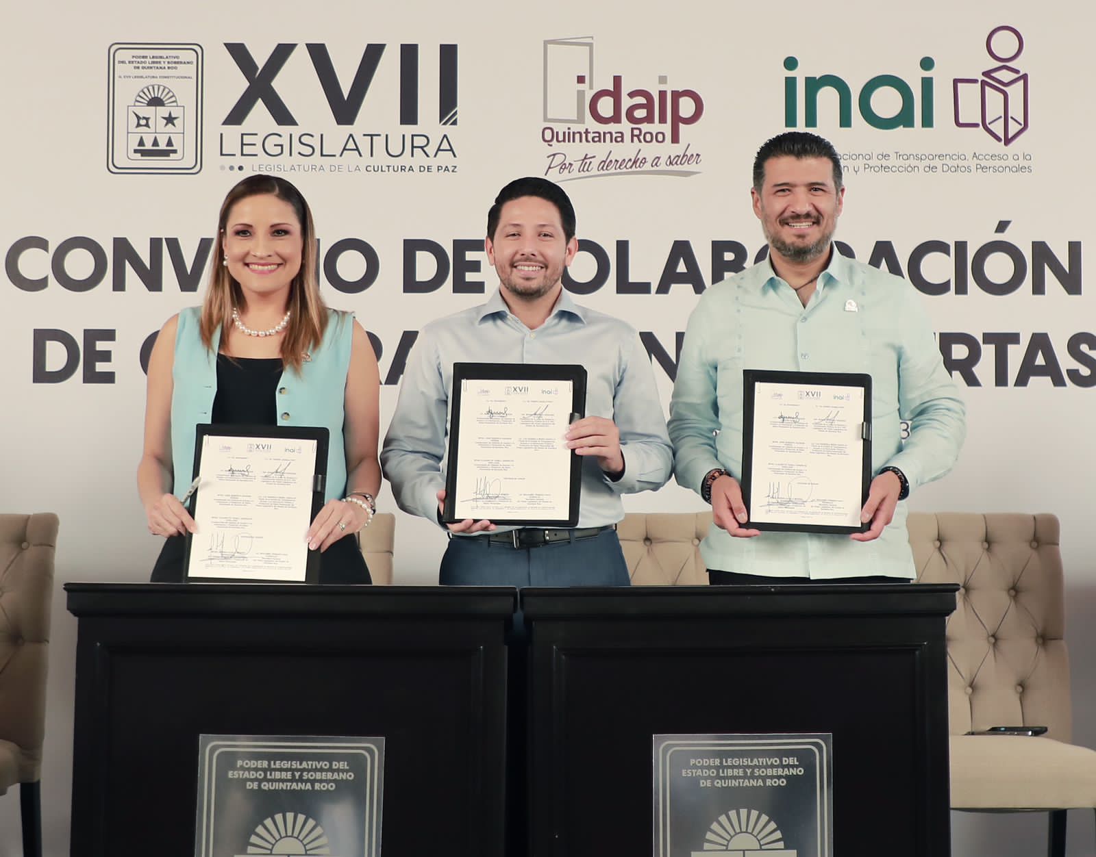 La firma del convenio estuvo a cargo del diputado Renán Sánchez Tajonar, presidente de la Junta de Gobierno y Coordinación Política (JUGOCOPO), así como la comisionada presidenta del IDAIPQROO Magda Lozano Ocman y el comisionado del INAI Adrián Alcalá Méndez.