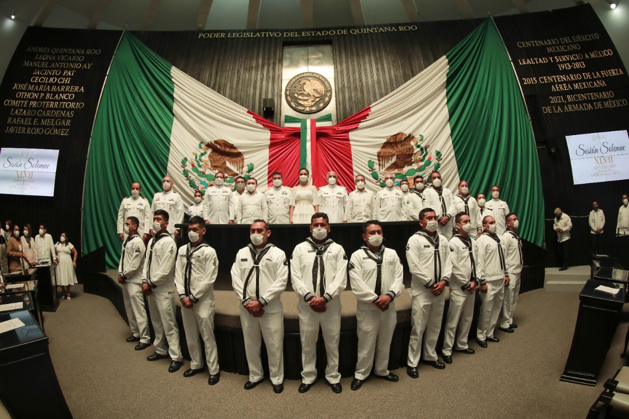 CHETUMAL. En el marco del XLVII aniversario de Quintana Roo como Estado Libre y Soberano, los Poderes Ejecutivo, Legislativo y Judicial, así como el Vicealmirante Javier Abarca García, comandante de la Quinta Región Naval, develaron la inscripción con letras doradas “2021, Bicentenario de la Armada de México”, en el muro de honor del salón de sesiones del recinto oficial del Poder Legislativo, como un reconocimiento a esta institución que nació para servir a México.