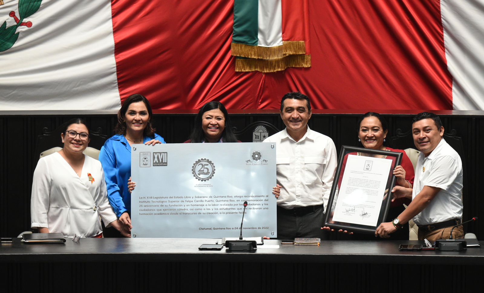 Chetumal.- En homenaje a la labor realizada por los ciudadanos y las ciudadanas que ejercieron cátedra, así como a las y los estudiantes que recibieron una formación académica desde el transcurso de su creación a la presente fecha, la XVII Legislatura del Estado de Quintana Roo hizo entrega de un reconocimiento al Instituto Tecnológico Superior de Felipe Carrillo Puerto, consistente en una placa conmemorativa y el decreto legislativo en el cual se hace el reconocimiento en el marco de su 25 aniversario.