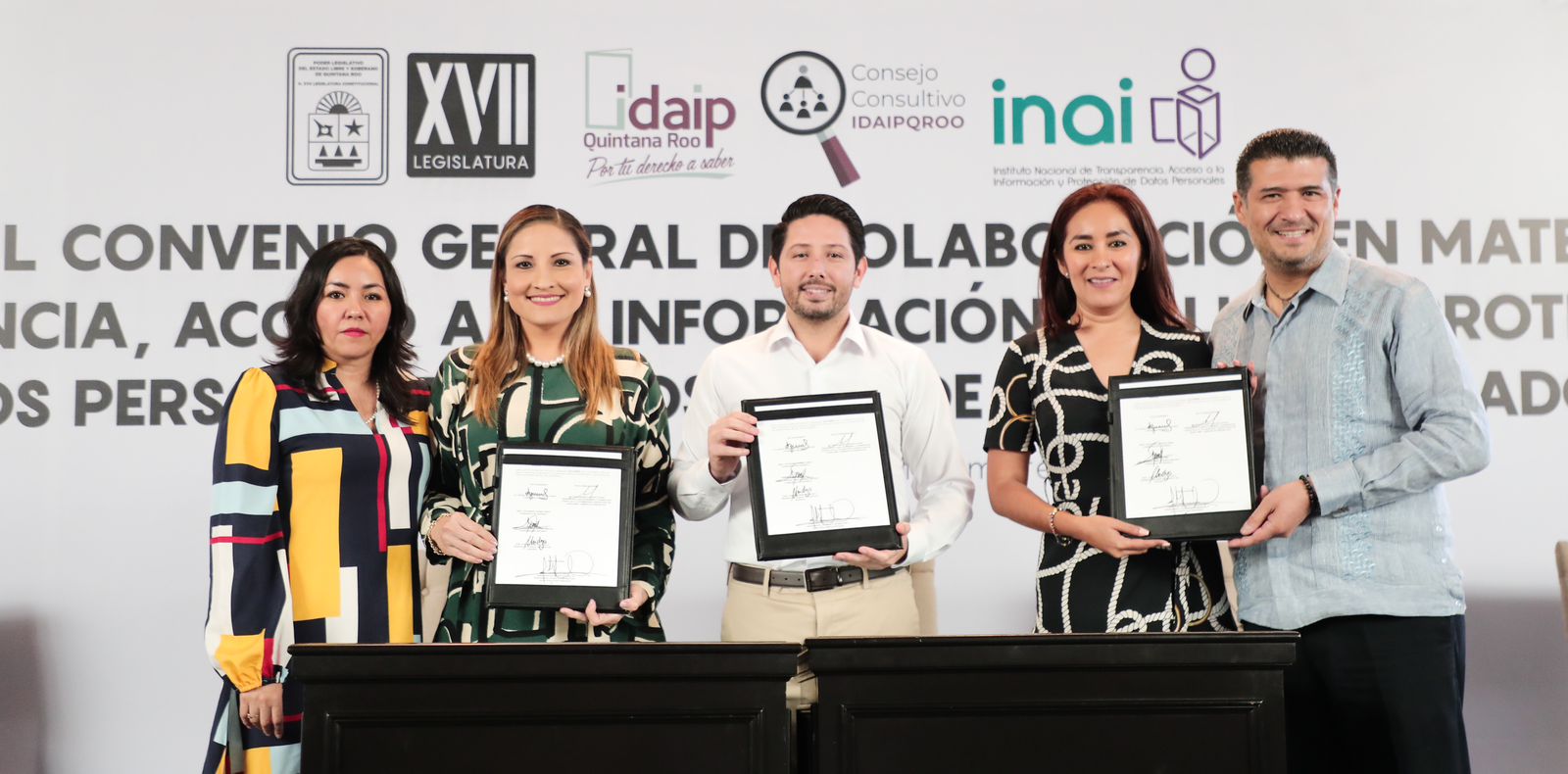 Chetumal, Quintana Roo. – Con el propósito de fortalecer la cultura cívica de la transparencia, la XVII Legislatura del Estado, el Instituto Nacional de Transparencia, Acceso a la Información y Protección de Datos Personales (INAI) y el Instituto de Acceso a la Información y Protección de Datos Personales de Quintana Roo (IDAIPQROO), firmaron un convenio general de colaboración en materia de transparencia, acceso a la información pública y protección de datos personales.