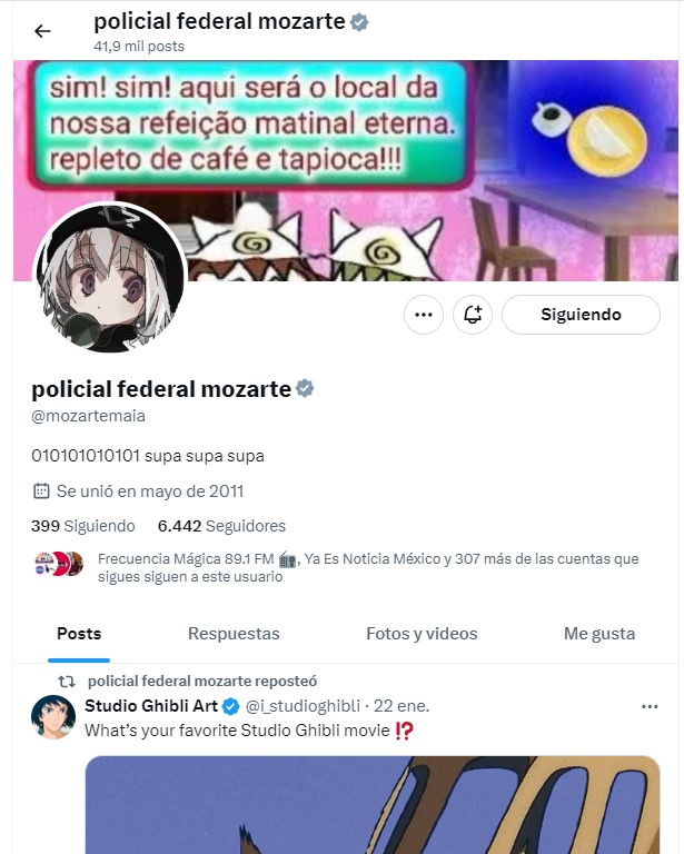 La cuenta aparece actualmente con el nombre de @mozartemania, y ha reposteado publicaciones de Hayao Miyazaki, quien de acuerdo con información web es un “Hayao Miyazaki es un director de cine de animación, animador, ilustrador, empresario, mangaka y productor de anime japonés, de renombre internacional y con una carrera de cinco décadas. Junto con Isao Takahata, fundó Studio Ghibli, un estudio de películas y animación”.