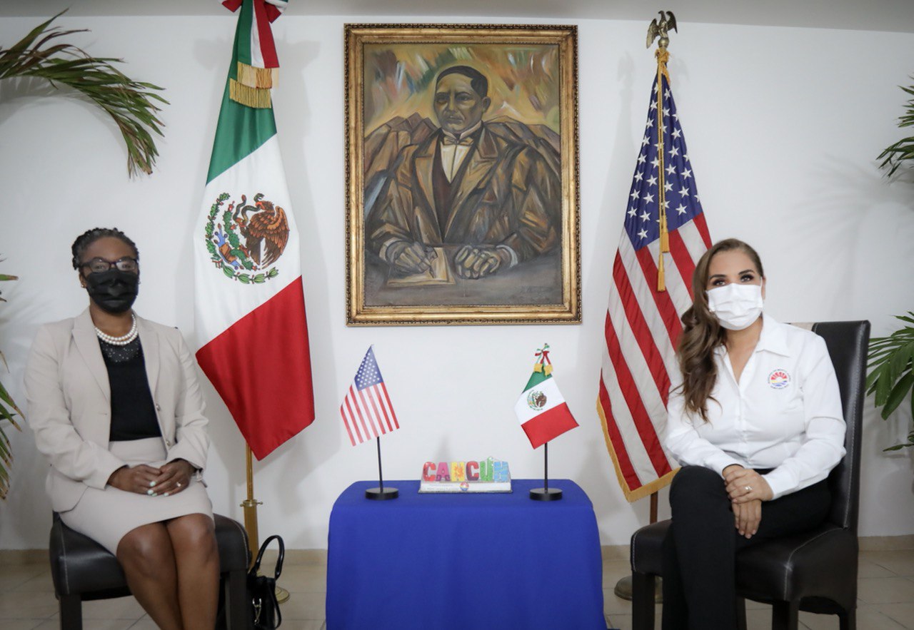 CANCÚN. LA presidenta municipal, Mara Lezama sostuvo una reunión con la cónsul general de Estados Unidos en Mérida, Dorothy Ngutter, a fin de estrechar lazos y desarrollar una relación bilateral con autoridades del vecino país, desde donde se recibe un importante número de turistas que prefieren a Cancún para vacacionar al considerarlo como un destino seguro y que cumple con los protocolos sanitarios.