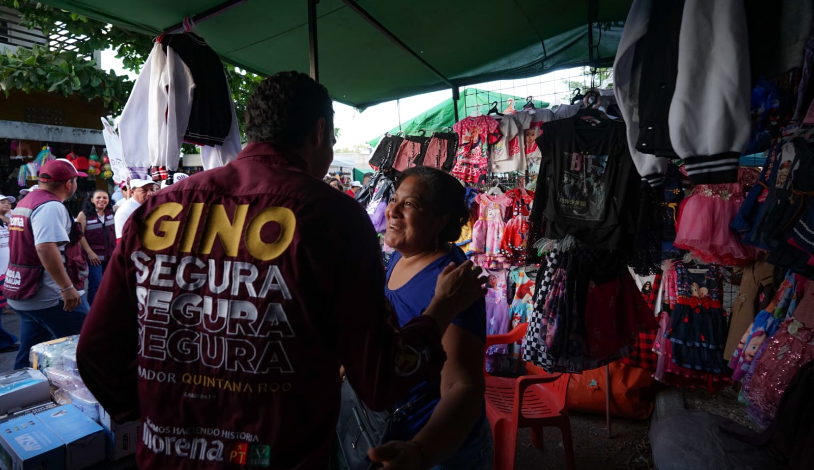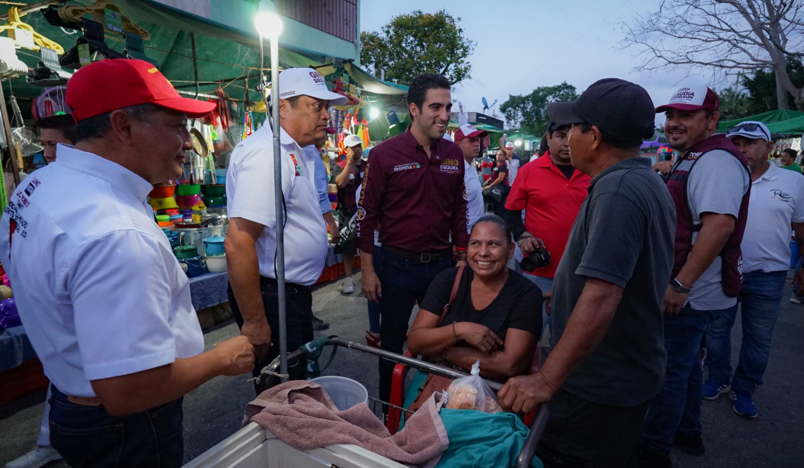 Cancún, Quintana Roo.- Los candidatos de la Coalición Sigamos Haciendo Historia, Gino Segura y Rubén Carrillo visitaron a los comerciantes del tianguis de la Región 107. Durante el recorrido escucharon las necesidades y propuestas para mejorar las condiciones de los tianguistas.