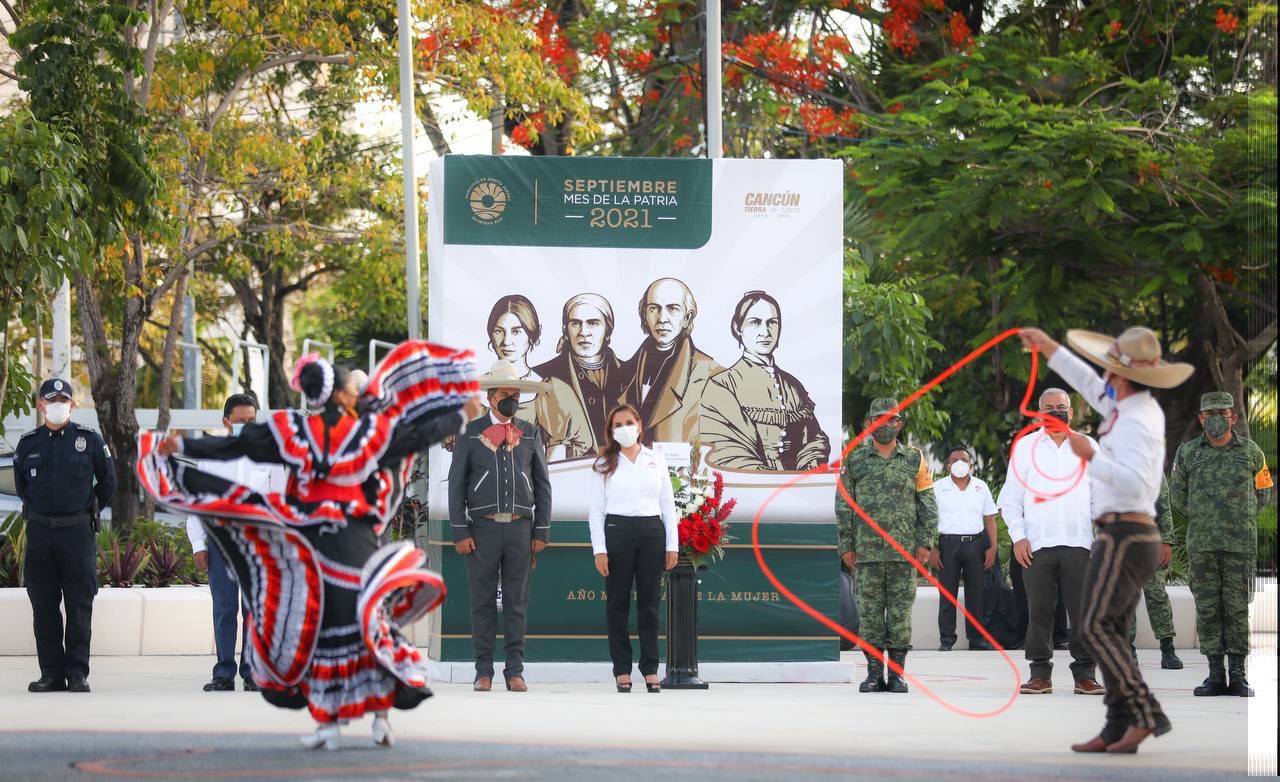 CANCÚN. La presidenta municipal Mara Lezama encabezó el izamiento de bandera y guardia de honor con motivo del 211 Aniversario del inicio de la lucha por la Independencia de México, en la Plaza de la Reforma del Palacio Municipal.