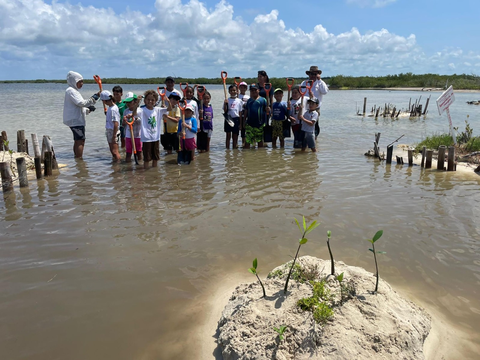 De igual manera está sucediendo en Punta Sur, donde los niños, niñas y jóvenes, colaboran en la restauración del ecosistema de manglar, sembrando propágulos de mangle rojo (Rhizophora mangle) con la asesoría del director del parque ecoturístico, Jesús Benavides Andrade, quien les ha explicado las características ecológicas y beneficios ecosistémicos de los humedales.