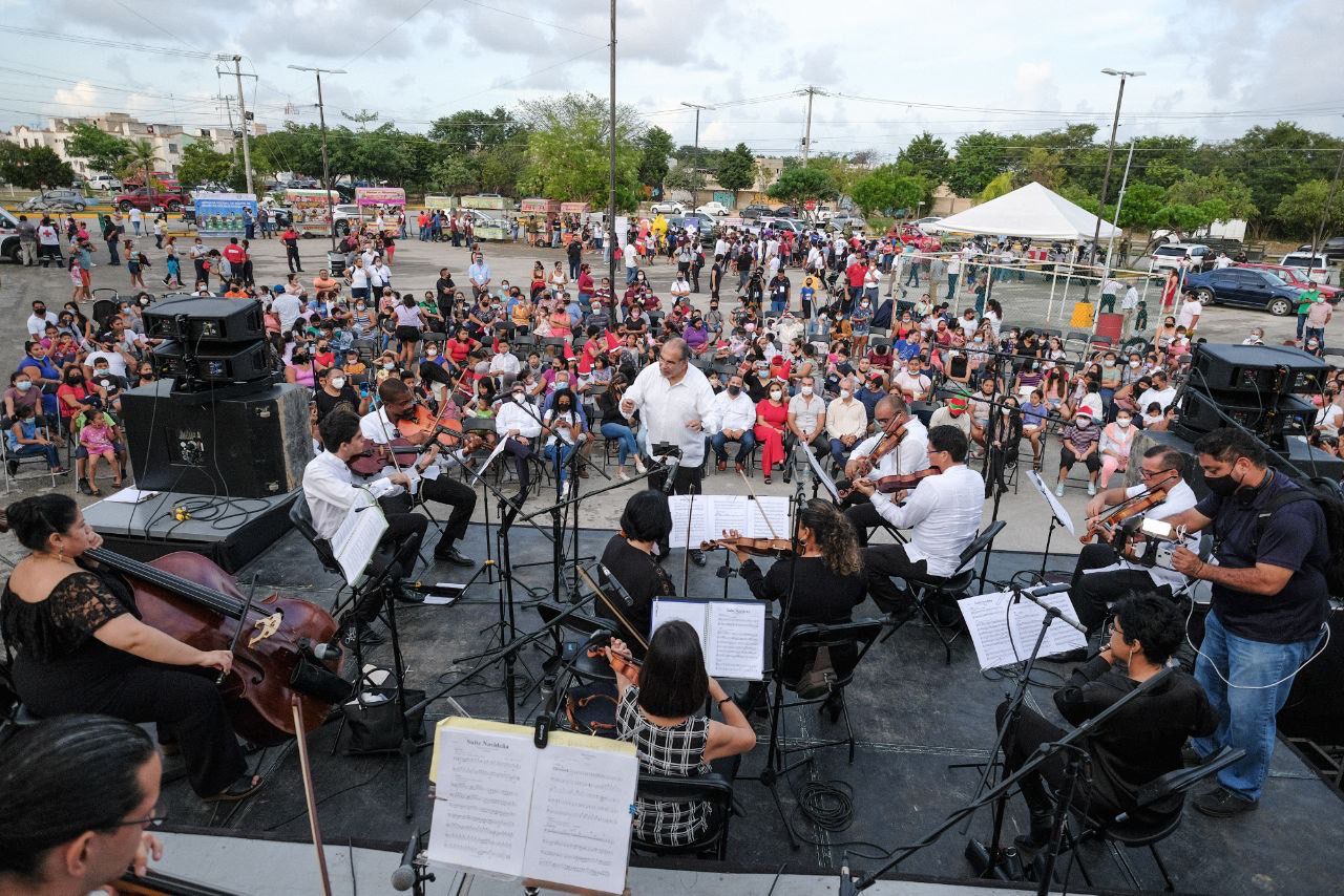CANCÚN.- El gobierno municipal realizó el “Concierto por la Paz”, en Villas otoch Paraíso, un evento cultural gratuito con la Orquesta de Cámara de Cancún, con el fin de disminuir la brecha de desigualdad social y promover la sana convivencia familiar para fomentar lazos de comunidad que permitan la recuperación del tejido social.