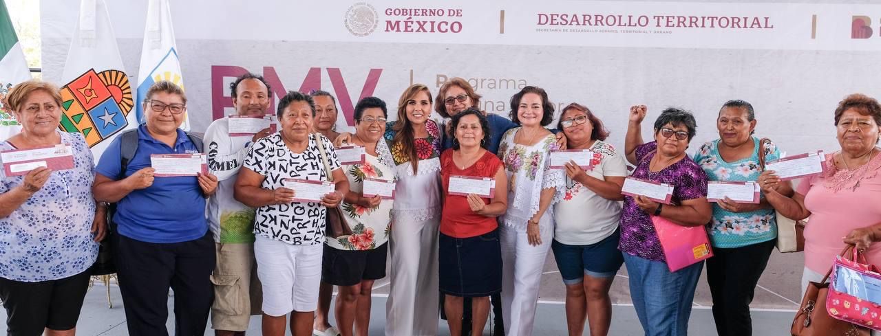 Mara Lezama estuvo acompañada de la subsecretaria de Ordenamiento Territorial de Sedatu, Edna Elena Vega Rangel; del delegado de Programas para el Desarrollo, Arturo Abreu Marín; de la presidenta municipal Juanita Alonso Marrufo, y de los beneficiarios María Celia Díaz y Manuel Hernández López.