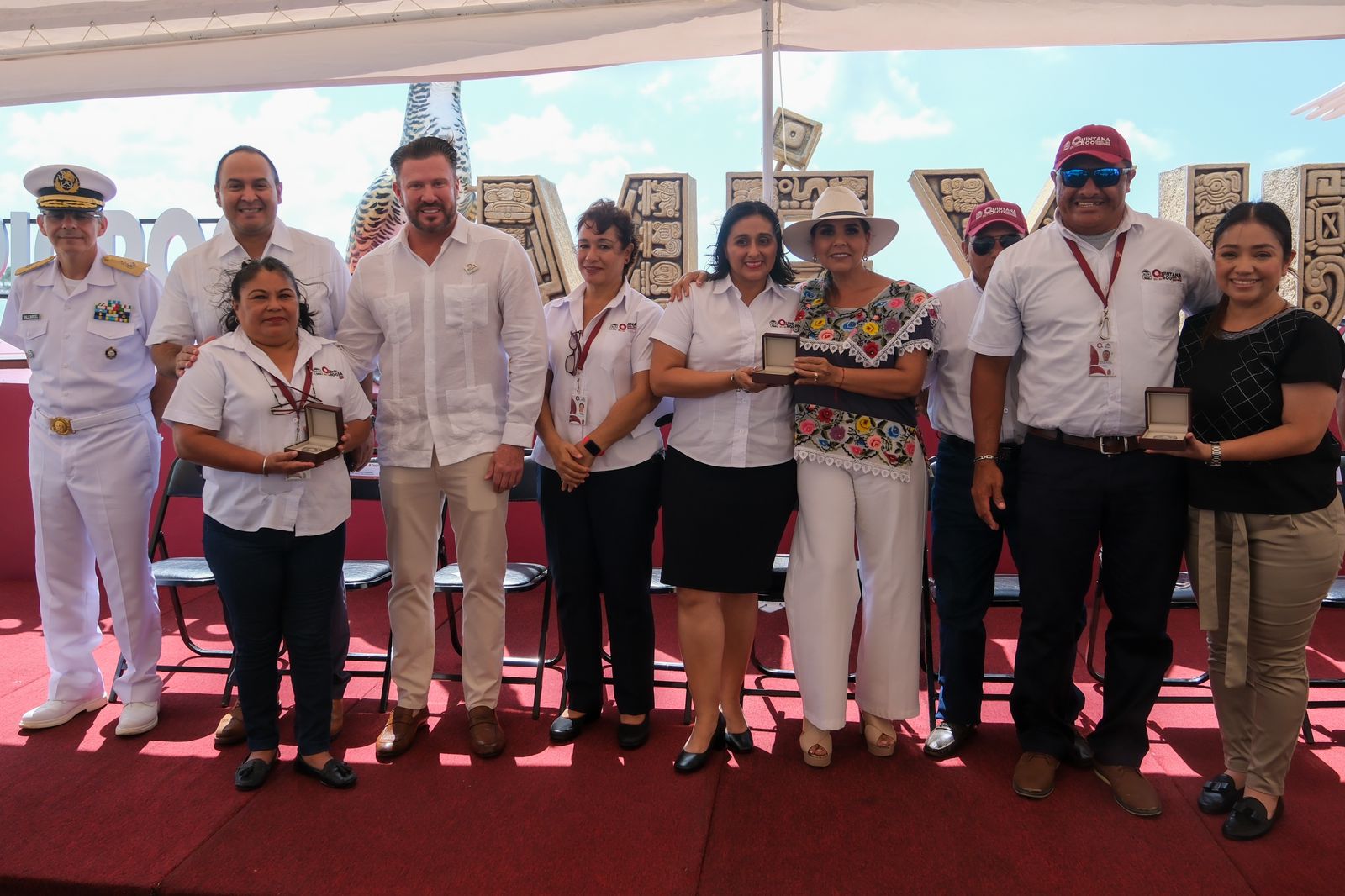 Durante la celebración del Día del Trabajador Portuario que se realizó en el muelle fiscal de Chetumal, la capital del estado, Mara Lezama y el director de la Administración Portuaria Integral de Quintana Roo (APIQROO), Vagner Elbiorn Vega, reconocieron el trabajo de quienes cuentan con 15, 20, 25 o más años de servicio. Asimismo, develaron la placa del “Salón de Directores de la APIQROO”.