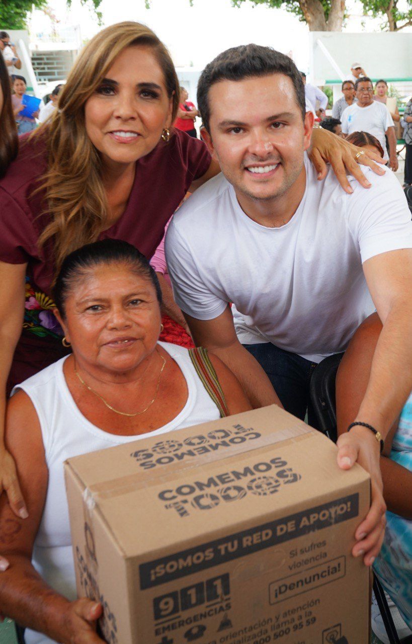 Puerto Morelos, Quintana Roo.– A ras de piso, la Gobernadora Mara Lezama y el Secretario de Bienestar, Pablo Bustamante, entregan de manera directa y gratuita, paquetes alimentarios “Comemos Tod@s” en Puerto Morelos, como parte del Programa del Bienestar “Mujer es Vida”, en la que se contó con la participación de la presidenta municipal de Puerto Morelos, Blanca Merari.