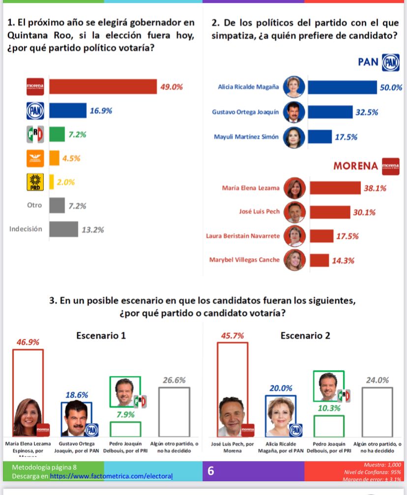 En otro apartado de la encuesta en el que se pregunta al ciudadano: “De los políticos del partido con el que simpatiza, ¿a quién prefiere de candidato?”, Mara Lezama vuelve a obtener la mayoría en el caso de Morena, con un 38.1% de intención de voto, seguida de José Luis Pech, con 30.1%; Laura Beristain con 17.5% y Marybel Villegas con 14.3%.