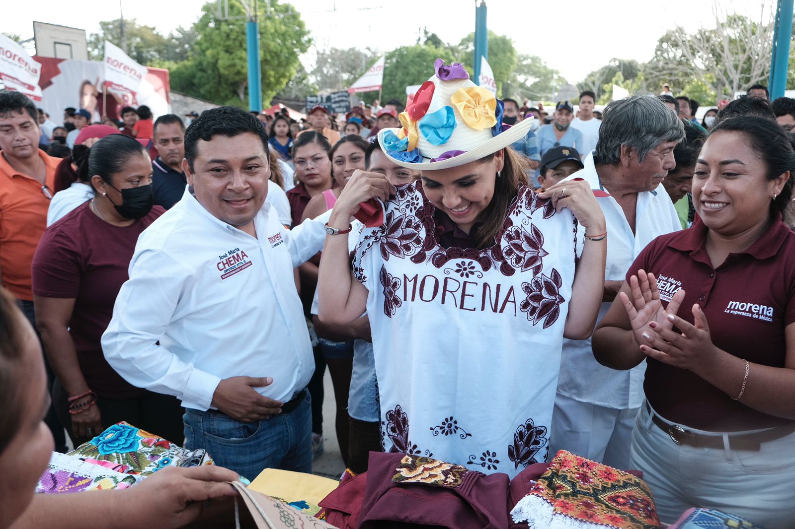 En esta comunidad, Mara Lezama recibió cálida bienvenida de las bordadoras, quienes le obsequiaron un sombrero con cintas de colores y un collar de flores elaboradas con listones blancos y guindas. Además, en el domo donde se realizó el mitin, instalaron puestos en los que la candidata compró una blusa blanca con la palabra “Morena” bordada, el cual se puso de inmediato.