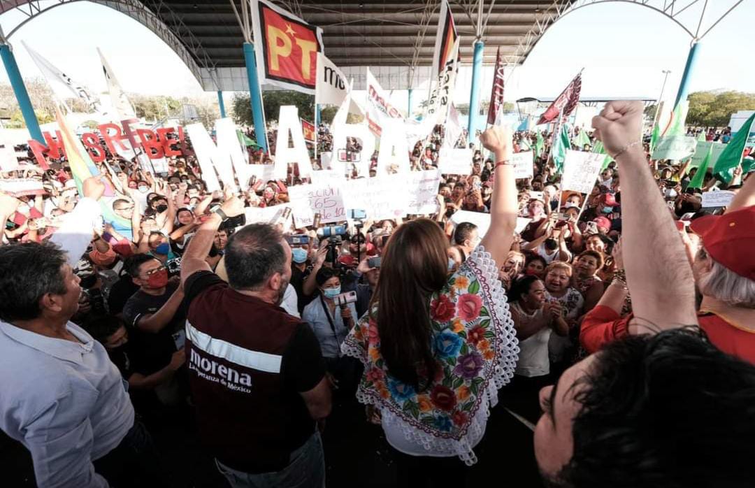 Hay que consolidar la Cuarta Transformación para cambiar la relación entre el gobierno, sus líderes y la comunidad, dijo la abanderada de Morena, PVEM, PT y FxM ante seguidores provenientes de comunidades como Sacalaca, Dziuché, Venustiano Carranza, X-Cabil, López Mateos, Mariano Matamoros, Plan de la Nación Poniente, Nueva Reforma y La Pimientita, quienes llegaron a la Unidad Deportiva José María Morelos en ruidosa caravana de vehículos.