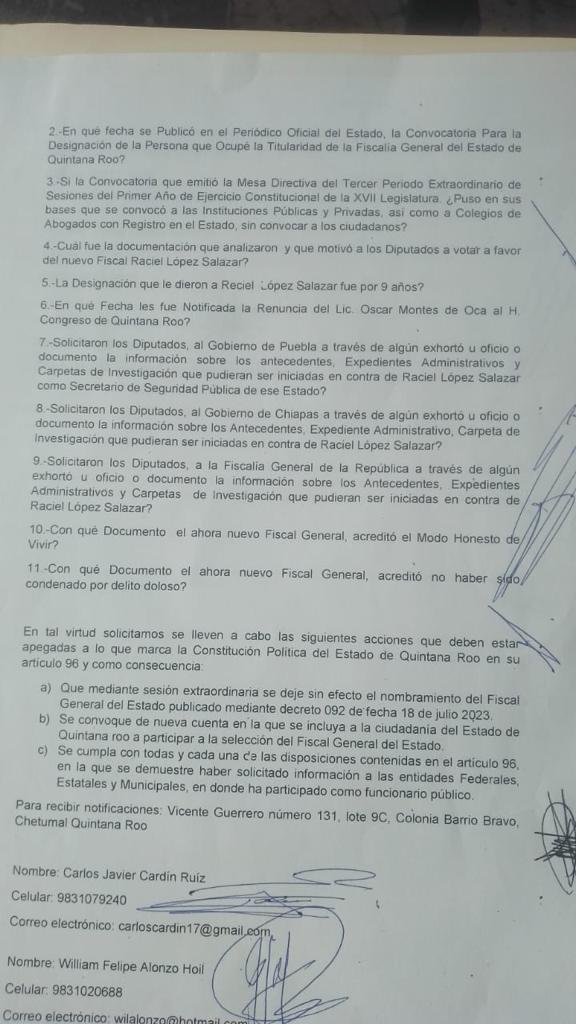 De igual forma, solicitaron que se vuelva a convocar a la ciudadanía, para que participe en la selección del Fiscal General del Estado, misma que debe incluir todas las disposiciones contenidas en el artículo 96 de la Constitución de Quintana Roo.