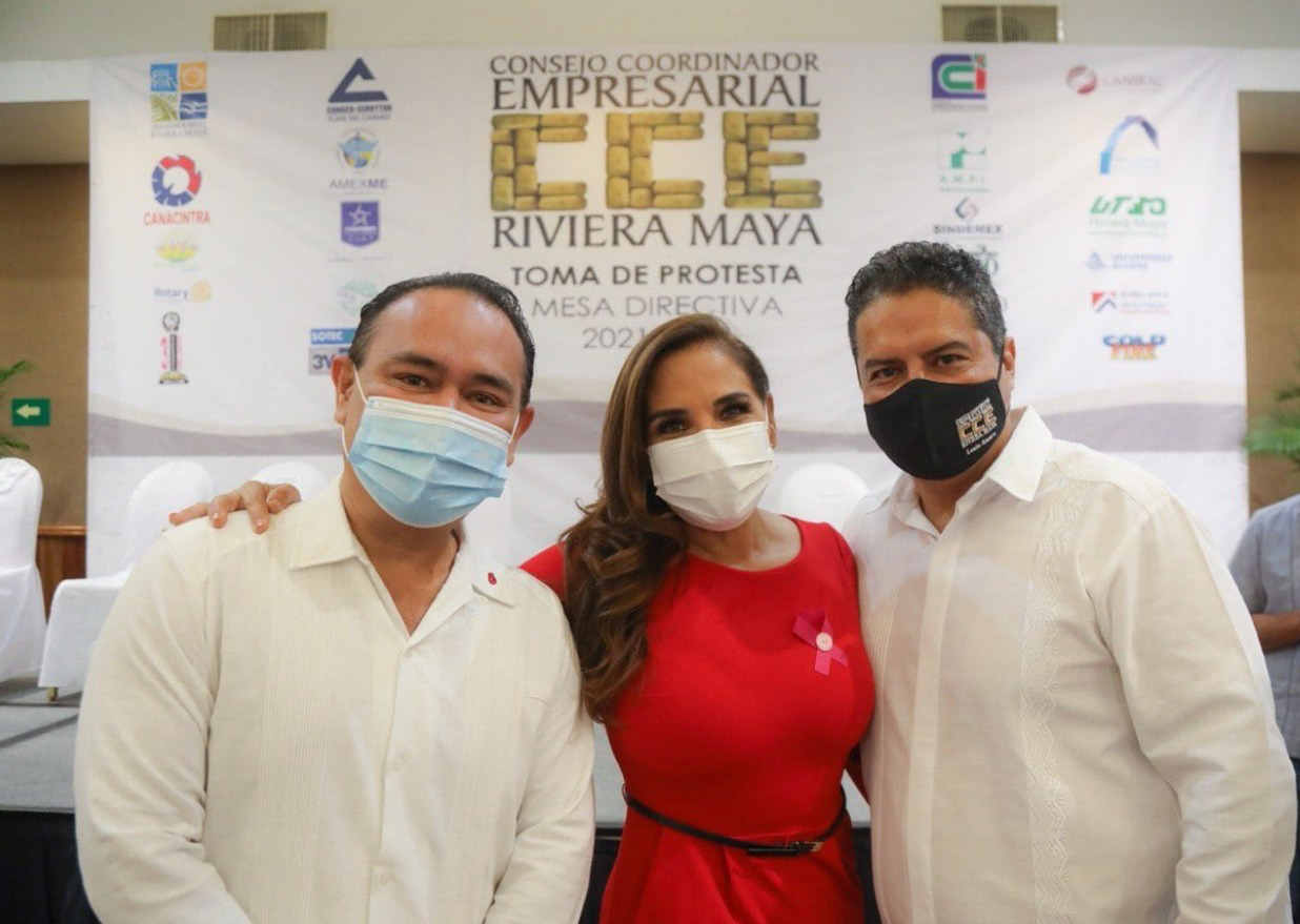 En ese marco, la presidenta municipal de Benito Juárez, Mara Lezama, atestiguó la toma de protesta de la mesa directiva 2021-2022 del Consejo Coordinador Empresarial (CCE) de la Riviera Maya, que presidirá Lenin Amaro Betancourt, evento encabezado por el gobernador Carlos Joaquín González.