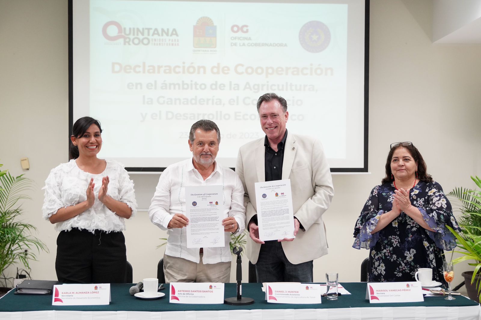 La firma de la declaración de cooperación bilateral entre Quintana Roo y el Departamento de Agricultura de Texas, en el ámbito de la agricultura, ganadería, comercio y desarrollo económico se llevó a cabo en la Universidad del Caribe, en el municipio de Benito Juárez.