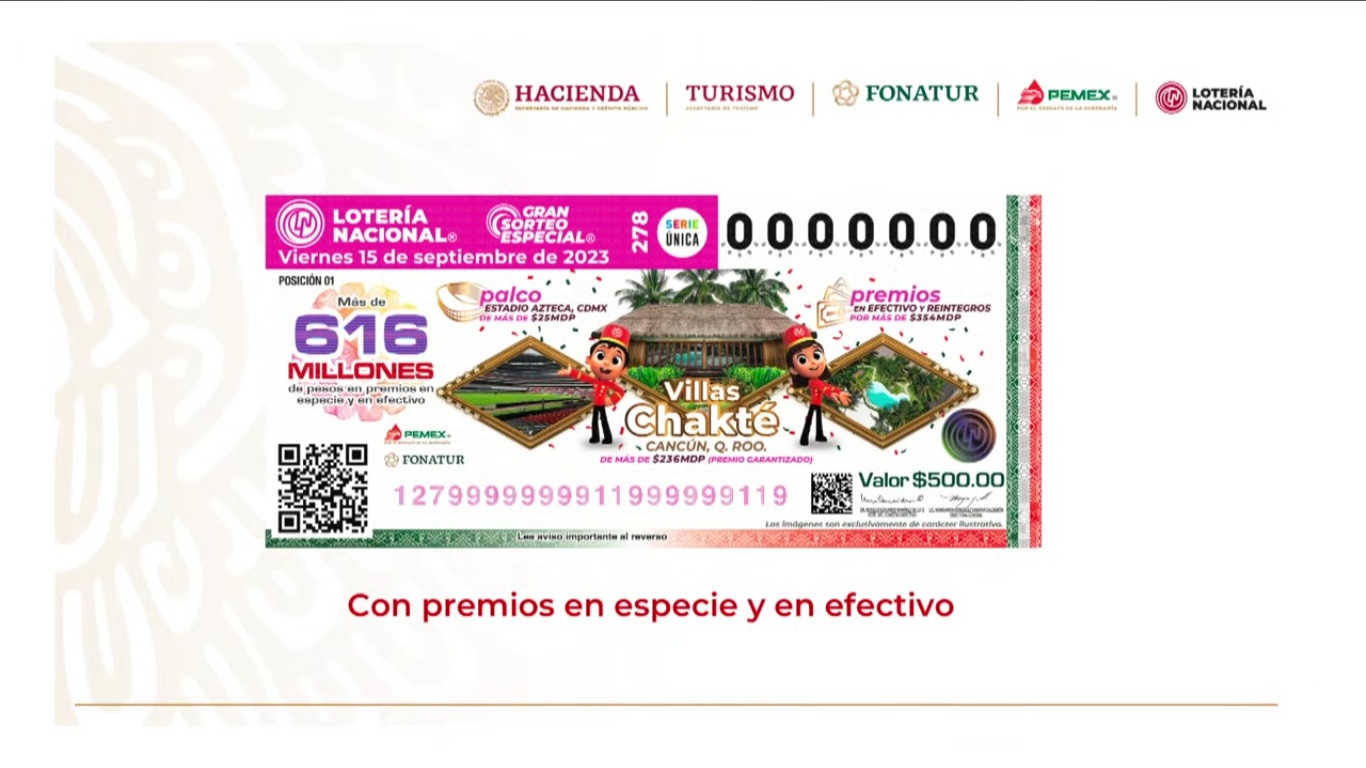 Ciudad de México.- El presidente de México, Andrés Manuel López Obrador, anunció que mañana la Lotería Nacional (Lotenal) rifará en su Gran Sorteo Especial “una casa que usaban como descanso los presidentes anteriores, en Cancún”, con un premio garantizado de 236 millones 043 mil 570 pesos.