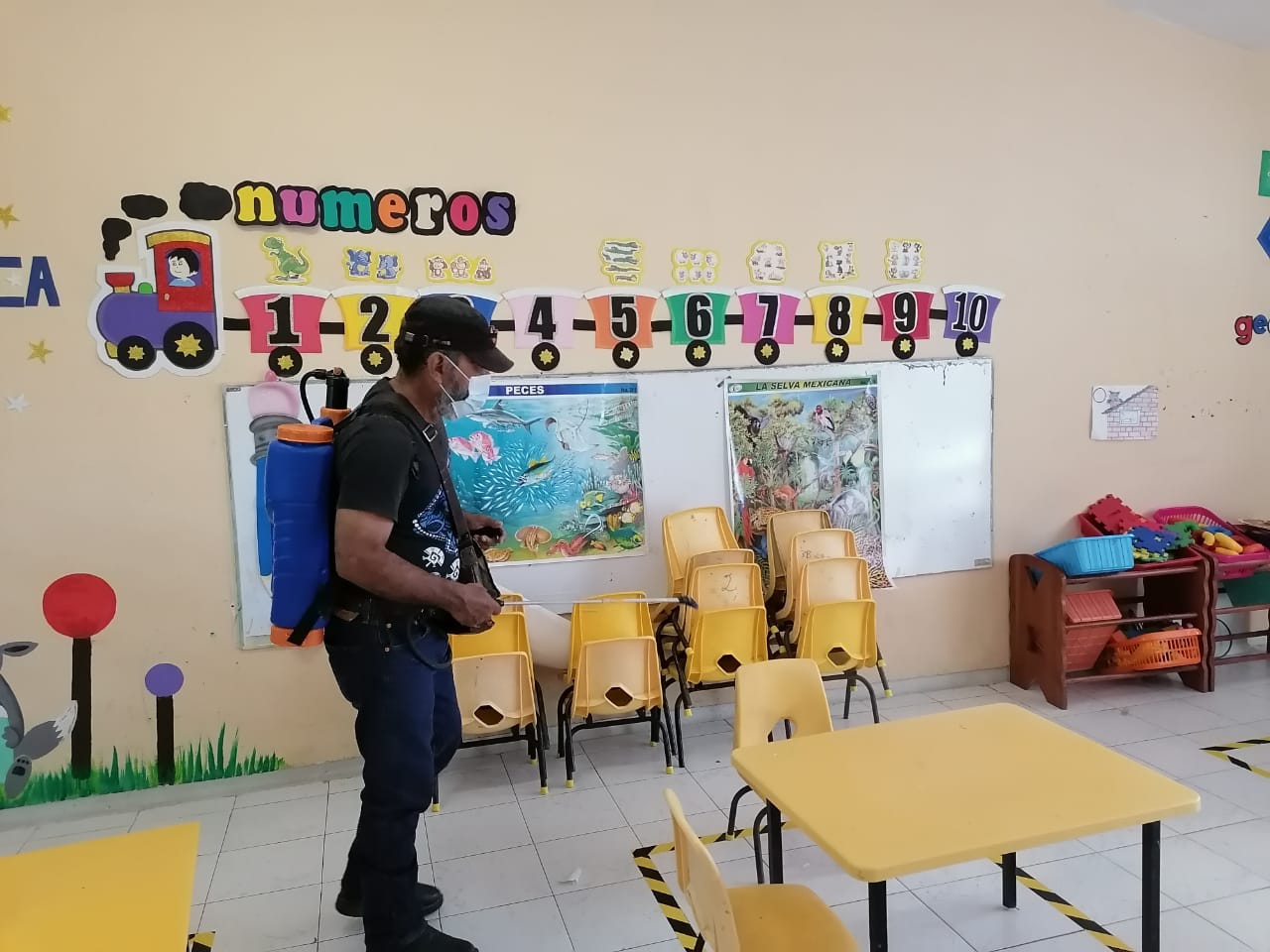 PUERTO MORELOS.- Como parte de las acciones para un regreso a clases presenciales de manera segura, durante dos días se llevaron a cabo jornadas para desinfectar escuelas públicas de nivel básico de la cabecera municipal de Puerto Morelos y la delegación de Leona Vicario, así como las comunidades de Delirios y Central Vallarta.