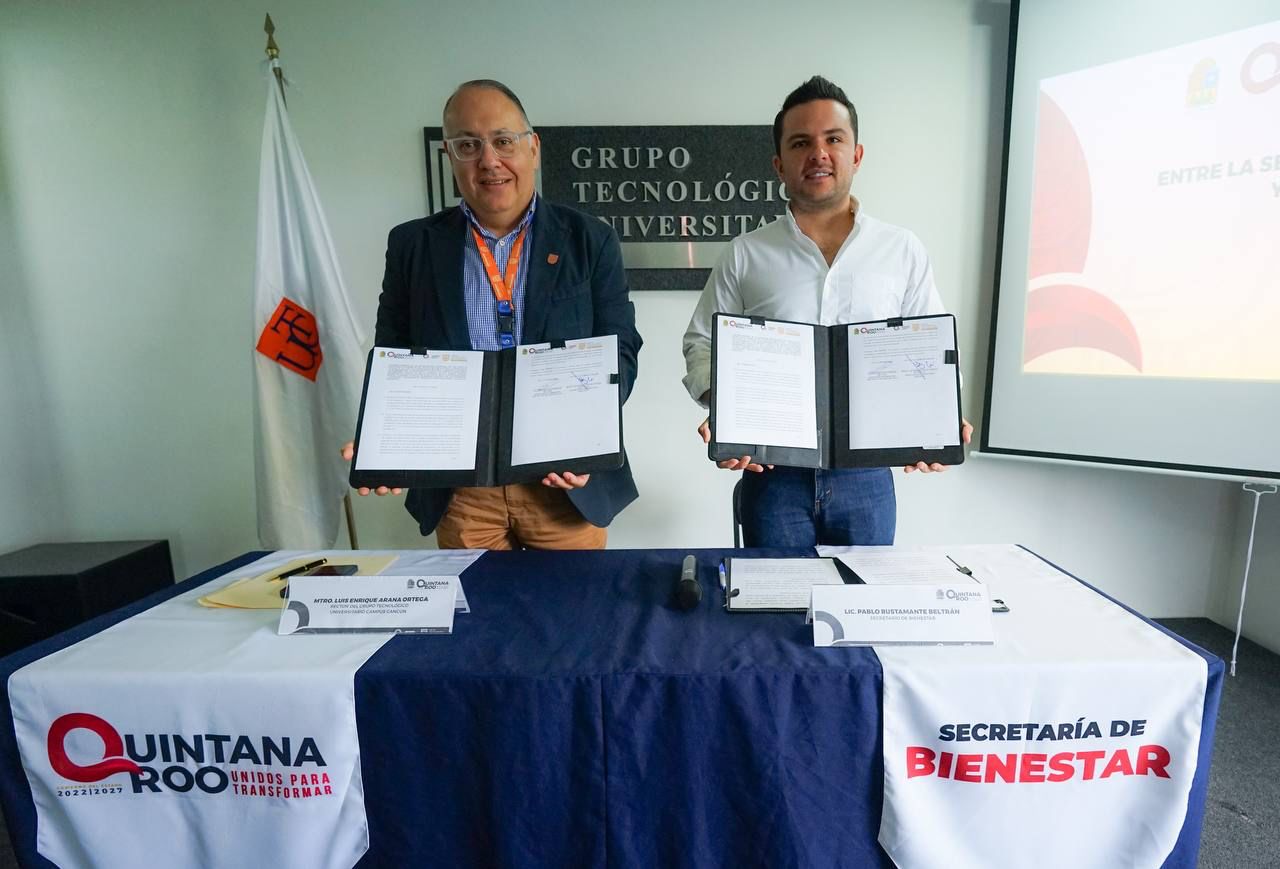 Cancún.– Pablo Bustamante Beltrán, Secretario de Bienestar, firmó un convenio con el rector del Grupo Tecnológico Universitario de Cancún, Luis Enrique Arana Ortega, para sumar la participación, ideas y proyectos de la juventud cancunense a las acciones de bienestar y la transformación de Quintana Roo.