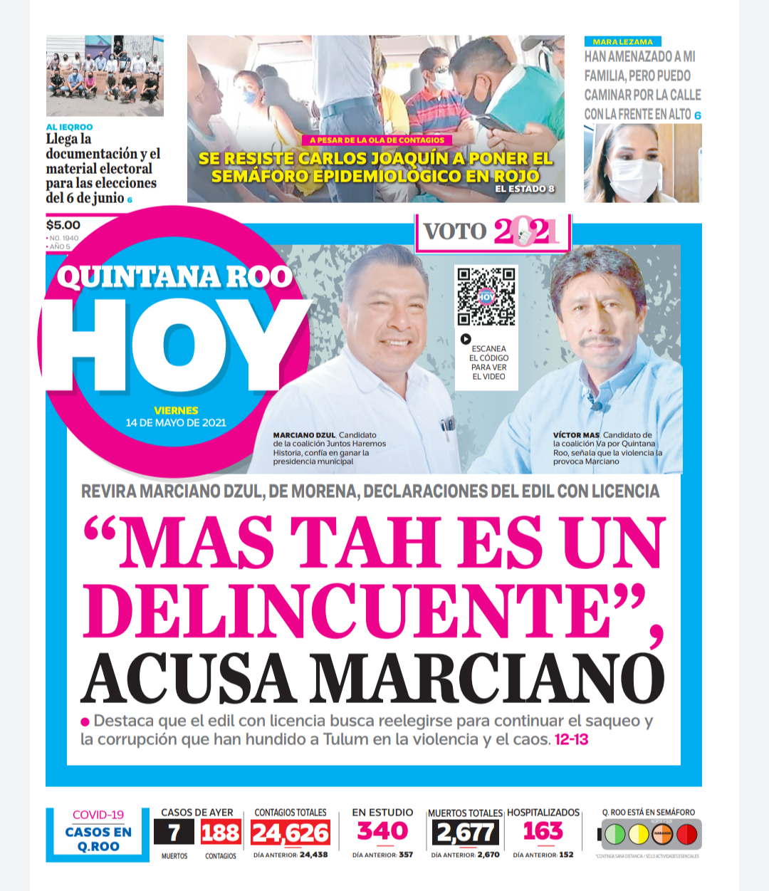CANCÚN. Luego de que a dos cuadras del Ayuntamiento apareciera una narcomanta en donde relacionan con el crimen organizado al alcalde con licencia Victor Mas Tah y que balacearon la casa de un integrante de su planilla, el ahora candidato que busca su reelección con la coalición “Va por Quintana Roo”, interpuso una denuncia ante la Fiscalía General del Estado (FGE) y posteriormente ofreció una rueda de prensa en donde acusó a su principal adversario, el candidato de Morena, Marciano Dzul de ser el responsable de los “hechos intimidatorios”.