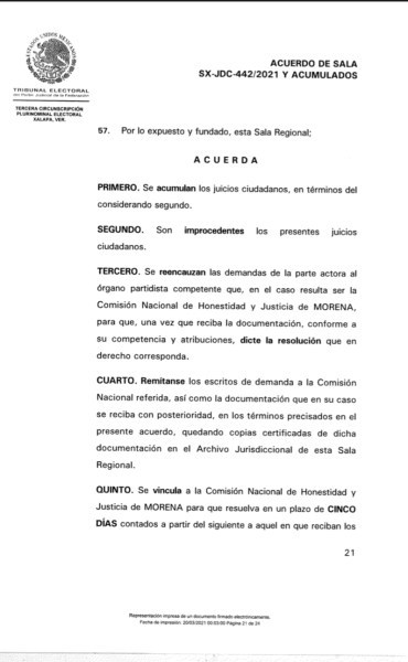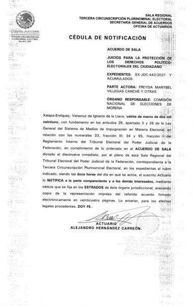 La Sala Regional Xalapa del TEPJF reencauzó la demanda a la Comisión Nacional de Honestidad y Justicia del partido Movimiento de Regeneración Nacional (Morena), quienes finalmente serán quienes resuelvan el asunto y a su vez deberán notificar a la parte actora.