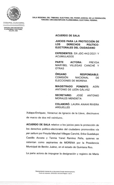 De acuerdo a los magistrados del la Sala Regional Xalapa del Tribunal Electoral del Poder Judicial de la Federación, en el caso de Villegas Canché, argumentaron que no agotó la instancia adecuada para darle trámite a la queja, que es la Comisión Nacional de Honestidad y Justicia (CNHJ) de Morena, por tal motivo, los magistrados determinaron la impugnación a esa instancia, que deberá resolver en un plazo de cinco días, desde que sea notificada.