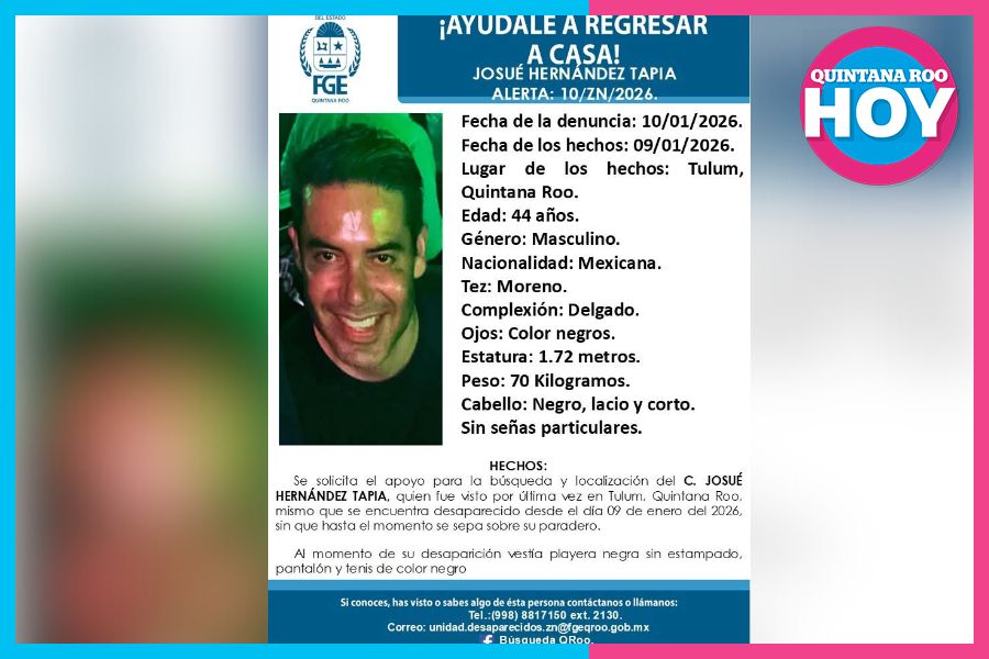 Tulum, Quintana Roo.– La Fiscalía General del Estado (FGE) de Quintana Roo activó una ficha de búsqueda para localizar a Josué Hernández Tapia, de 44 años, reportado como desaparecido en el municipio de Tulum.