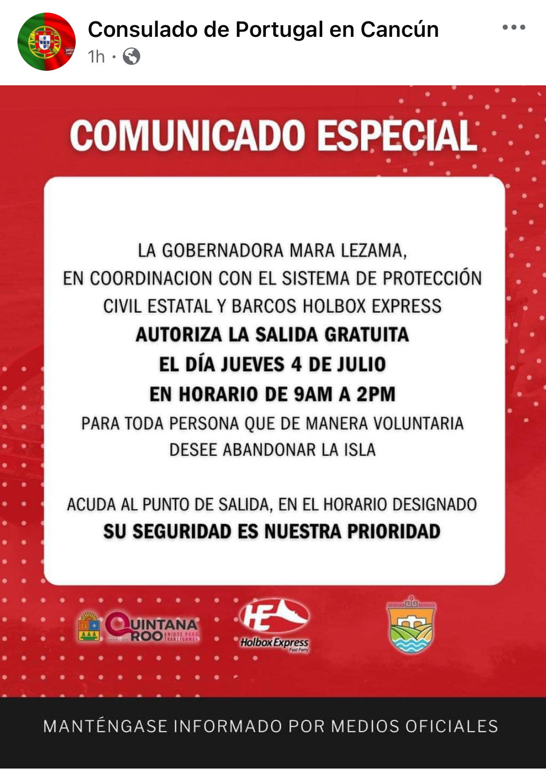 El Consulado de Portugal en Cancún replicó a sus ciudadanos en Holbox el mensaje de la gobernadora Mara Lezama, sobre la salida gratuita de la Isla, a bordo de los feerys de Holbox Express de 9:00 a 14:00 horas este jueves.