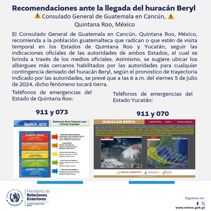 El gobierno de Guatemala sugirió a sus compatriotas a “ubicar los albergues más cercanos habilitados por las autoridades para cualquier contingencia”, y atender las recomendaciones del gobierno de México y de Quintana Roo.