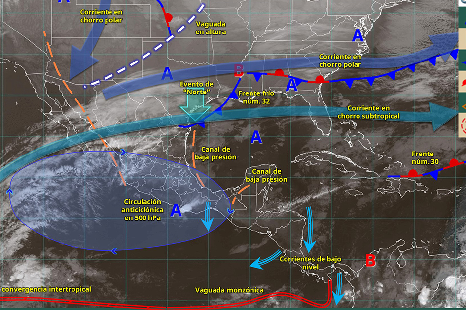Por otro lado, el frente frío número 32 recorrerá el noreste y oriente de la República Mexicana, además una vaguada en altura que recorrerá la frontera norte y noreste de México y el aporte de humedad de las corrientes en chorro polar y subtropical, generarán chubascos y lluvias fuertes en estados del norte, noreste y oriente del territorio nacional, con lluvias puntuales muy fuertes en Veracruz (Nautla, Los Tuxtlas y Olmeca).