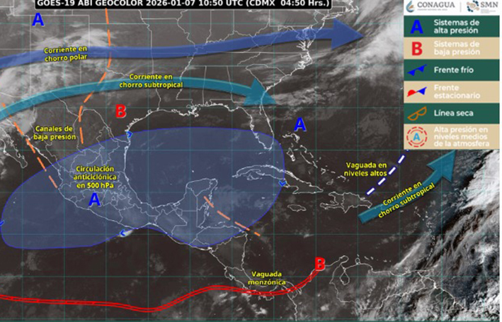 Por otra parte, una circulación anticiclónica en niveles medios de la atmósfera mantendrá cielo despejado y baja probabilidad de lluvia en el resto de la República Mexicana. Finalmente, se mantendrá el ambiente frío a muy frío, con heladas y bancos de niebla matutinos en estados de la Mesa del Norte y la Mesa Central.