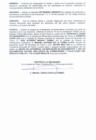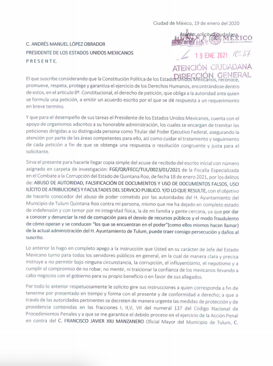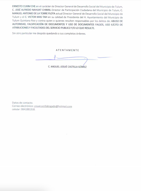 TULUM. Miguel Josué Castilla Gómez, ex funcionario del Ayuntamiento de Tulum y quien interpuso una denuncia en contra del alcalde Victor Mas Tah y otros funcionarios, con la carpeta de investigación FGE/QR/FECC/TUL/0023/01/2021 en la Fiscalía Especializada en el Combate a la Corrupción del estado de Quintana Roo, por los delitos de abuso de autoridad, falsificación de documentos, uso de documentos falsos, uso ilícito de atribuciones y facultades del servicio público, está solicitando medidas de protección, ya que teme por su integridad física.