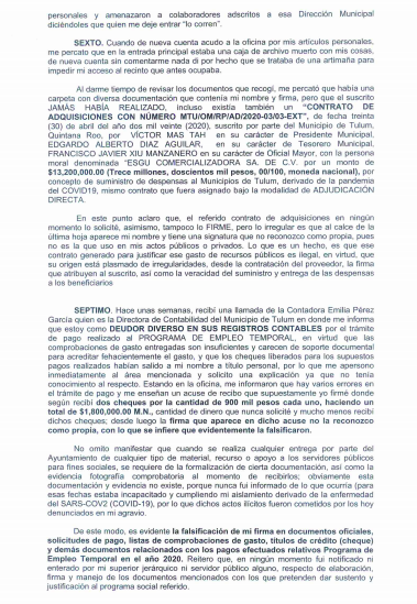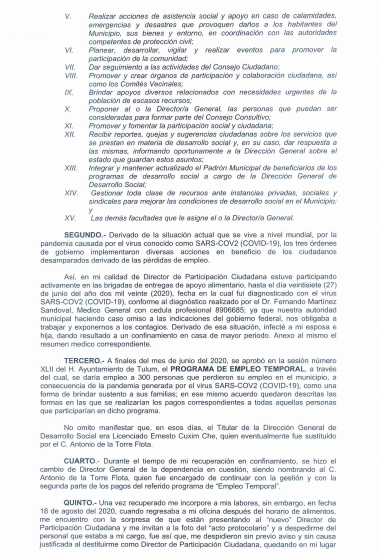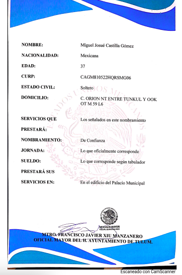 En su relato, Castilla Gómez recordó que en octubre del año 2018 fue nombrado como titular de la Dirección de Participación Ciudadana en el Ayuntamiento de Tulum, sin embargo, fue despedido el 18 de agosto del 2020, debido a que no se quiso prestar a las maniobras sucias del presidente municipal.